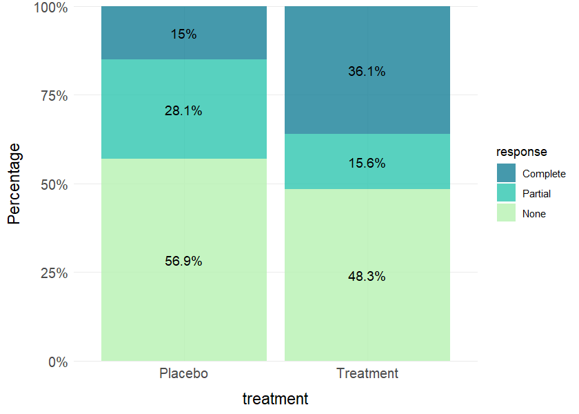 plot_bar(data = clinical_df, x = "treatment", group = "response", position = "fill", values = TRUE)