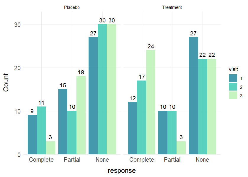 plot_bar(data = clinical_df, x = "response", group = "visit", facet = "treatment", values = TRUE)