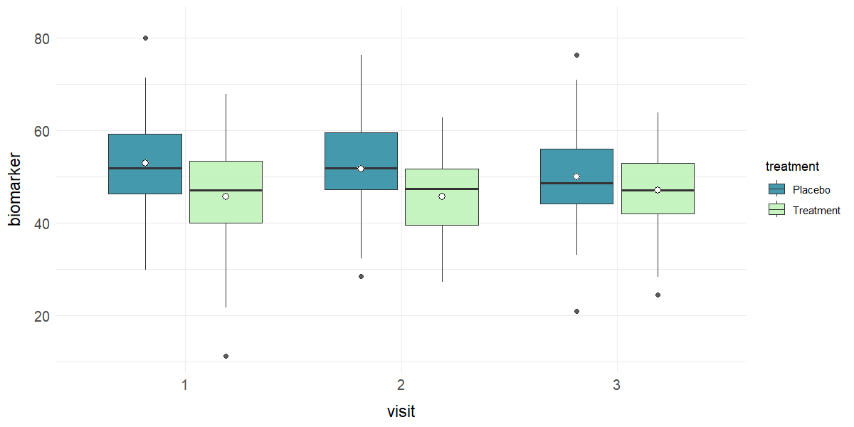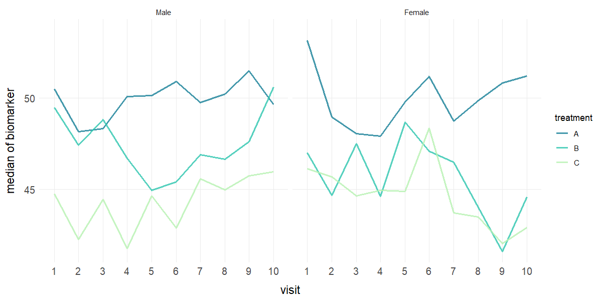 plot_line(data = clinical_df_full, x = "visit", y = "biomarker", group = "treatment",