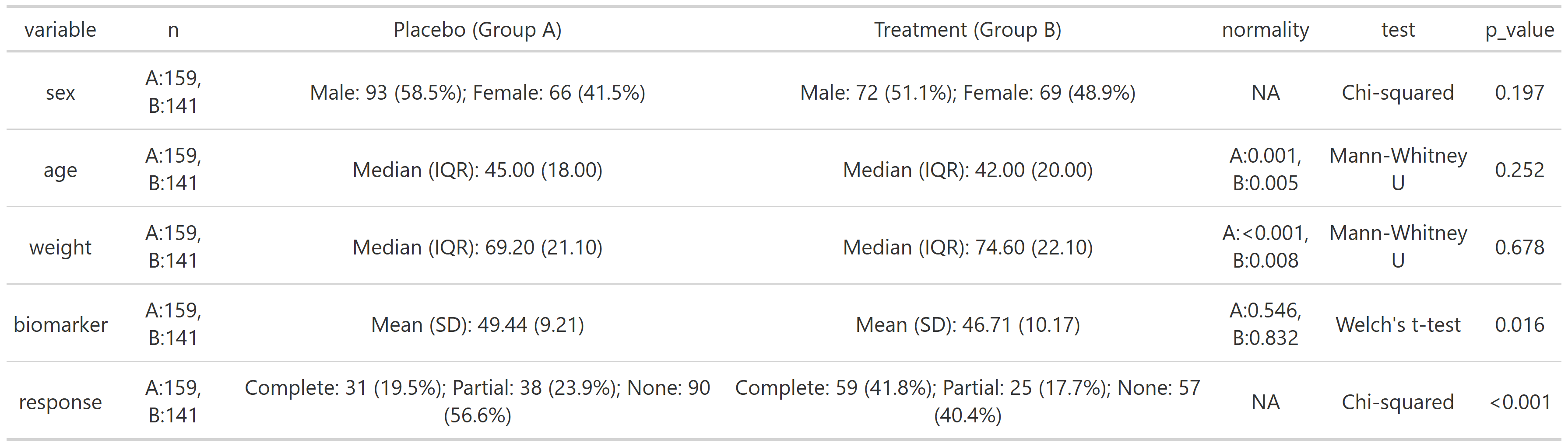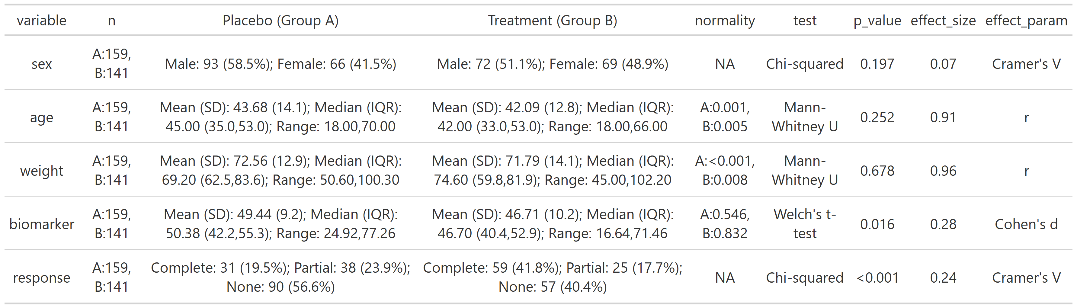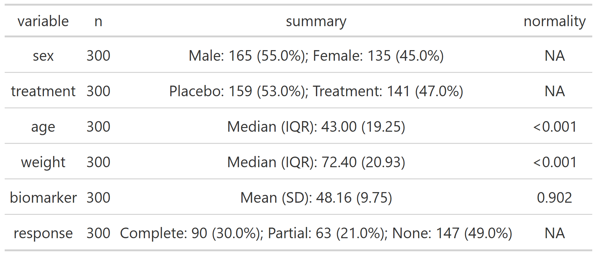 #> participant_id visit sex treatment age weight biomarker response